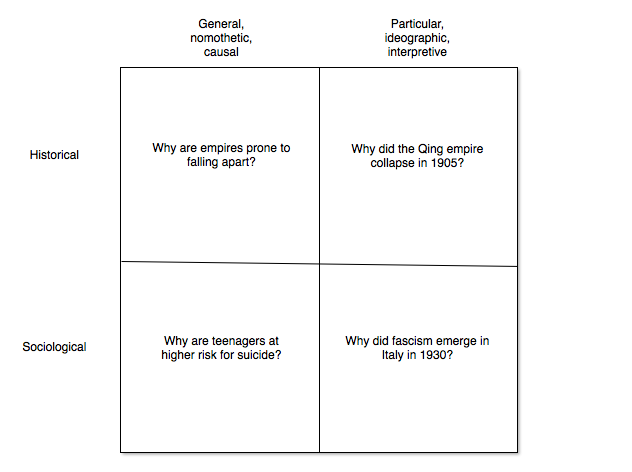 On this approach, only two of the cells would be occupied: sociological / general and historical / particular. There are no general historical explanations and no particular sociological explanations.