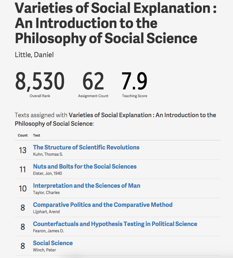 VSE appears in 62 syllabi in the database, and it is most commonly paired with Kuhn, Elster, Taylor, Lijphart, Fearon, and Winch. The syllabi including VSE break down by discipline like this: sociology (23), politics (5), economics (5), psychology (4), philosophy (1), other (28). There are 200 titles with which it is paired in at least four syllabi. Some of these would fit handily into a philosophy of social science course; others are more distant.