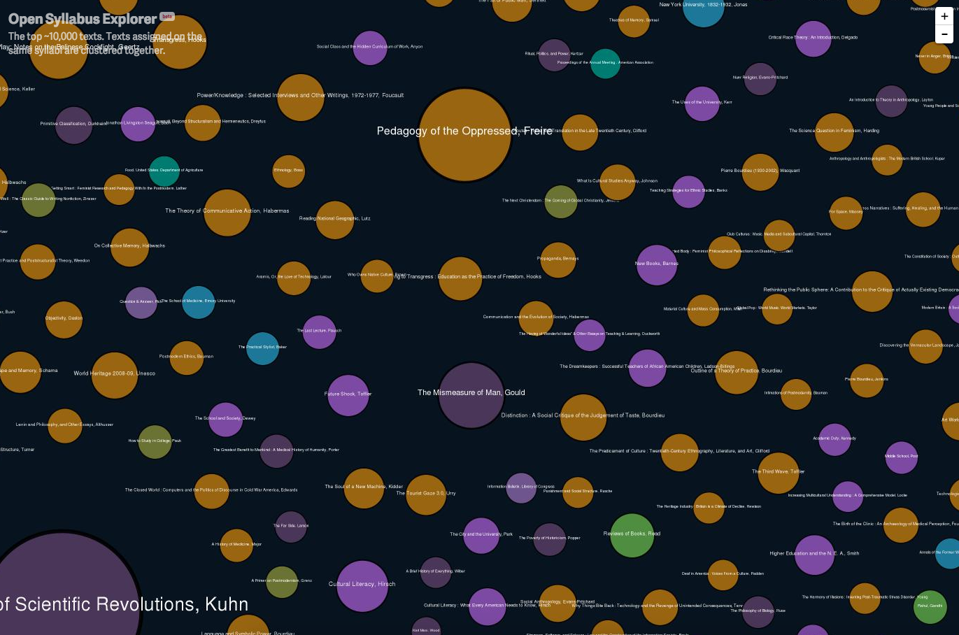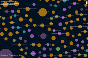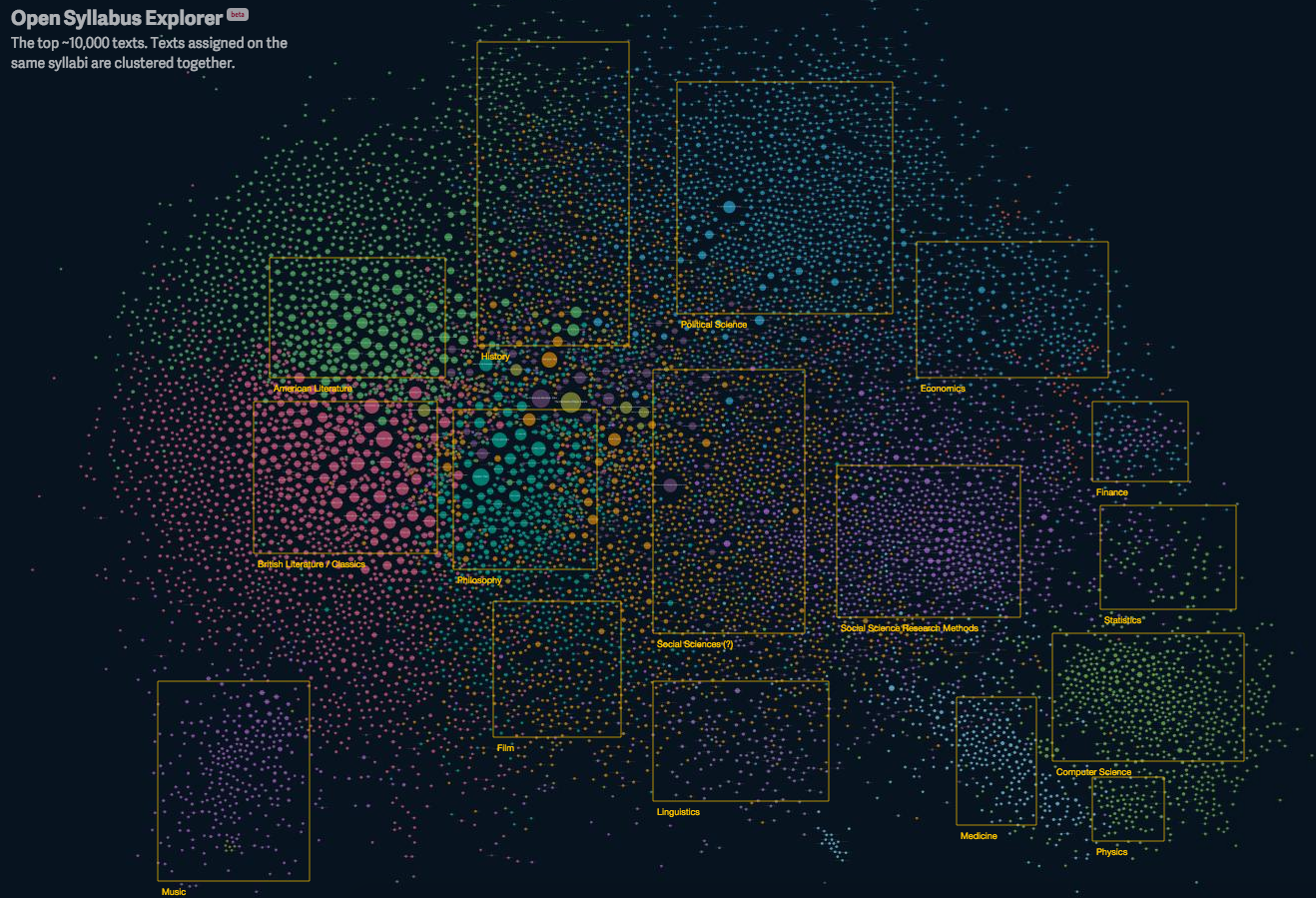 Here is a fascinating and ambitious “big data” project that aims at probing and mapping the structure of the disaggregated university curriculum in the United States and other English-speaking countries. The project is called the Open Syllabus Project and is hosted at Columbia University with a team including Joe Kraganis (project director), David McClure (Stanford University Library), Dnnis Tenen, Jonathan Stray, Alex Gil, and Ted Byfield, along with others. The project has collected over a million syllabi that are openly accessible on university websites; it has then created a database of the books and articles included in these syllabi. There are currently 934K items in the database of texts.