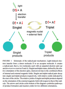 So the hypothesis is that birds (and possibly other organisms) have evolved ways of exploiting “spin chemistry” to gain a signal from the presence of a magnetic field. What is spin chemistry? Here is a definition from the spin chemistry website (yes, spin chemistry has its own website!) (link):