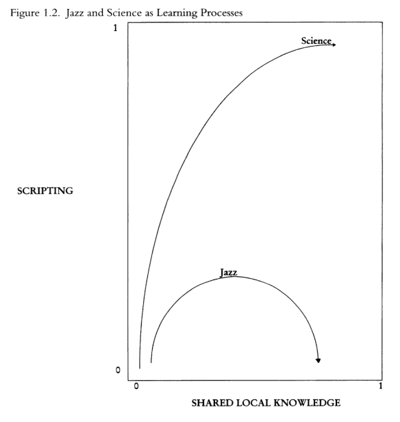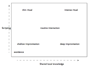 Especially important here is a distinction that Tilly draws between “degree of scripting” and “degree of local knowledge” to analyze both individual actions and collective actions. He believes we can classify social action in terms of these two dimensions. Figure 1.1 indicates his view of the kinds of action that occur in the four extreme quadrants of this graph — thin and intense ritual, and shallow and deep improvisation. And he offers the examples of science and jazz as exemplars of activities that embody different proportions of the two characteristics.
