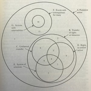 It is interesting to observe that the whole diagram takes place within the domain of purposive action (A). This illustrates Coleman’s fundamental presupposition about the social world: that social outcomes result from purposive, intentional actions by individuals. If we imagined that religious rituals were purely performative, serving as expressions of inner spiritual experience — we would find that these “social events” have no place in this diagram. Likewise, if we thought that there is an important role for emotion, solidarity, hatred, or love in the social world — we would find that actions and phenomena involving these factors would have no place in the diagram.