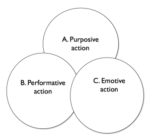 Would this modified scheme give a different orientation to the “sociological imaginary”? Might we imagine that the theories of important intersectional figures like Bourdieu, Tilly, or Foucault might fall in the intersection of all three circles? Would episodes of contentious politics involve actions that are purposive, emotive, and performative? Is there any reason (parsimony, perhaps) to attempt to reduce emotion and performance to a different kind of purpose? Or it is better to honestly recognize the diversity of kinds of action and motivation? My inclination is to think that Coleman’s choice here reflects “rational choice fundamentalism” — the idea that ultimately all human actions are driven by a calculation of consequences. And this assumption seems unjustified.