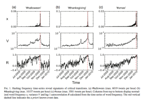 Researchers on the dynamics of mass social media have addressed the question of critical transitions. Kuehn, Martens, and Romero (2014) provide an interesting approach in their article, “Critical transitions in social network activity” (link). Also of interest is Daniel Romero’s “An epidemiological approach to the spread of political third parties”, co-authored with Christopher Kribs-Zaleta, Anuj Mubayi, and Clara Orbe (link).