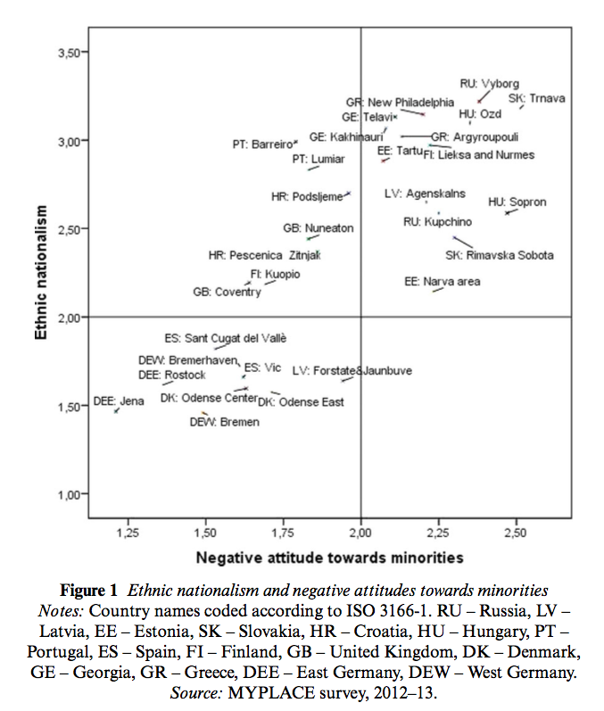 Using new data collected as part of the MYPLACE youth survey, in this article we have explored young people’s support for far right ideology and analysed which factors are associated with holding far right views. We find that despite comparatively low immigration rates, young people in post-socialist locations, along with Greek locations, tend to have more negative predispositions and to be more xenophobic and exclusionist towards immigrants than young people in Western European locations. Moreover, we have demonstrated that young Europeans’ views on immigrants vary greatly even within the boundaries of one country, thus below-national level analysis should be the preferred strategy in future studies.