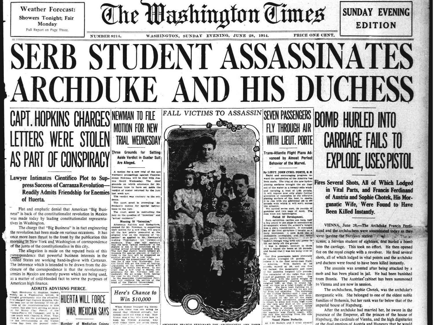 The page from the Washington Times above draws attention to an event that was itself highly contingent and yet explicable (the bungled but eventually successful effort to assassinate Archduke Ferdinand); leading to an important historical event (the outbreak of World War I) which was also both contingent and explicable.