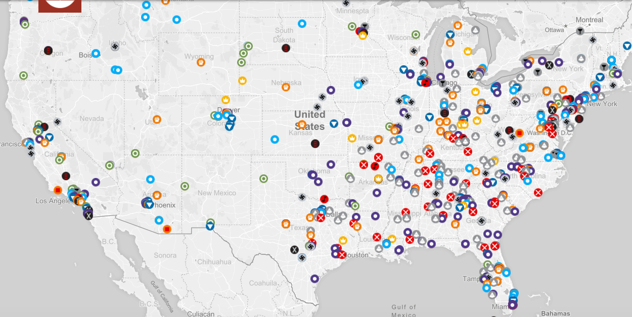 The Southern Poverty Law Center documents that hate groups and hate-based mobilization are on the rise in the United States (link, link). Here is a current map of hate-based groups monitored by SPLC:
