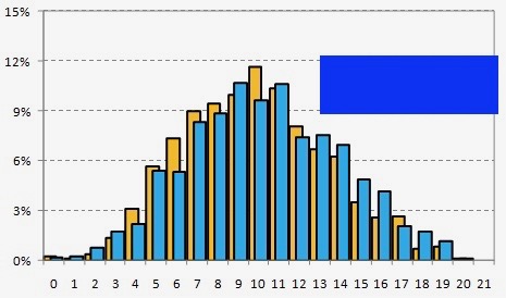 The blue organization shows a distribution of individuals who are on average more accepting of religious diversity than the gold organization. The weighted score for the blue population is about 10.4, in comparison to a weighted score of 9.9 for the gold population. This is a relatively small difference between the two populations; but it may be enough to generate meaningful differences in behavior and performance. If, for example, the attitude measured here leads to an increased likelihood for individuals to make disparaging comments about the co-worker’s religion, then we might predict that the gold group will have a somewhat higher level of incidents of religious intolerance. And if we further hypothesize that a disparaging work environment has some effect on work productivity, then we might predict that the blue group will have somewhat higher productivity.