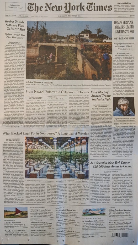 In light of these interests, I find the front page of the New York Times on March 28, 2019 to be a truly fascinating amalgam of the social ontology of government, with a heavy dose of dysfunction. Every story on the front page highlights one feature or another of the workings and failures of government. Let’s briefly name these features. (The item numbers flow roughly from upper right to lower left.)