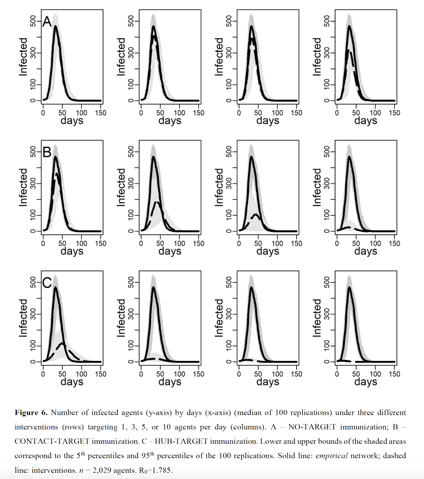 The simulation is run multiple times for each of the three treatment strategies, using four different “budgets” that determine the number of individuals to be treated on each scenario. The results are presented here, and they are dramatic. Both contact-sensitive strategies of treatment result in substantial reduction in the total number of individuals infect over the course of 50, 100, and 150 days. And this in turn translates into substantial reduction of the number of ICU beds required on each strategy.
