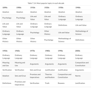 These results permit many other kinds of questions and discoveries. For example, in chapter 7 Weatherson distills the progression of topics across decades by listing the most popular five topics in each decade: