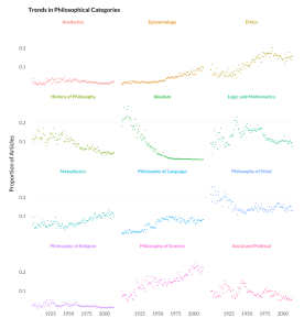 Brian Weatherson, a philosopher at the University of Michigan, has a different idea about how we might proceed in mapping the development of philosophy over the past century (link) (Brian Weatherson, A History of Philosophy Journals: Volume 1: Evidence from Topic Modeling, 1876-2013. Vol. 1. Published by author on Github, 2020; link). Professional philosophy in the past century has been primarily expressed in the pages of academic journals. So perhaps we can use a “big data” approach to the problem of discovering and tracking the emergence of topics and fields within philosophy by analyzing the frequency and timing of topics and concepts as they appear in academic philosophy journals.