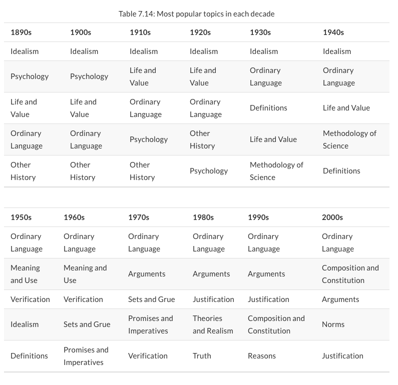 These results permit many other kinds of questions and discoveries. For example, in chapter 7 Weatherson distills the progression of topics across decades by listing the most popular five topics in each decade:
