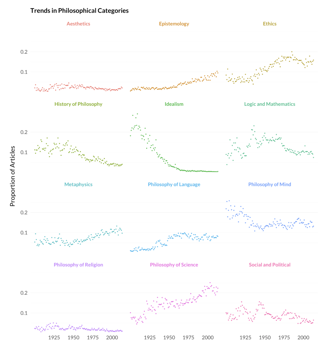 We can look at these graphs as measures of the rise and fall of prevalence of various fields of philosophy research in the Anglophone academic world over the past century. Most striking is the contrast between idealism (precipitous decline since 1925) and ethics (steady increase in frequency since about the same time, but each category shows some interesting characteristics.