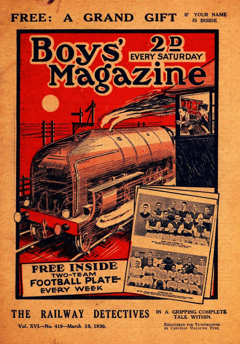 Falling strictly within this class there are at present ten papers, the GEM, MAGNET, MODERN BOY, TRIUMPH and CHAMPION, all owned by the Amalgamated Press, and the WIZARD, ROVER, SKIPPER, HOTSPUR and ADVENTURE, all owned by D. C. Thomson & Co. …