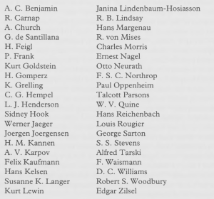 The photo immediately struck me as familiar. It seemed to be the side entrance to Emerson Hall, home of the philosophy department at Harvard. So I did some searching on the web and found that there was a meeting of the International Congress for the Unity of Science (the descendent of the Vienna Circle), which took place at Harvard September 3-9, 1939. This was the fifth and final congress. And both Neurath and Tarski were in attendance. It seems likely enough, then, that this photo is from the 1939 gathering at Harvard. Here is Gerald Holton’s list of the attendees and presenters at the Congress (Science and Anti-Science):