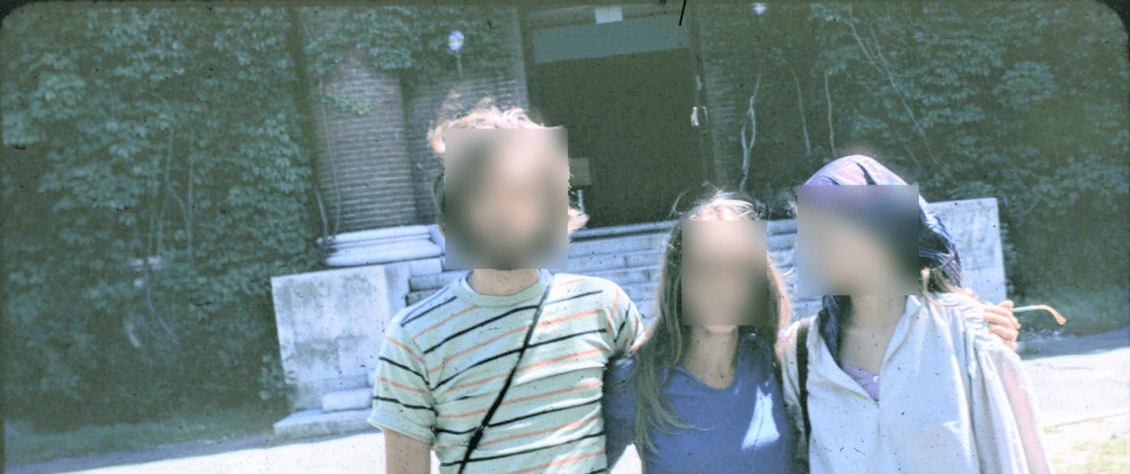 I’m convinced — this certainly looks like the same location to me. Harvard has made some improvements on the entrance since 1939 — the door is modernized, the lamps have been added, the vines have been pruned, and the handrails have been provided. The shape of the brick columns to the sides of the entrance is visible through the vines in the 1939 photo. I seem to remember luxuriant vines from the 1970s on that face of the building. And indeed, that is true. Here is a segment of a photo of the same entrance from 1973, and it shows the vines are more extensive. (Also there are no handrails.)
