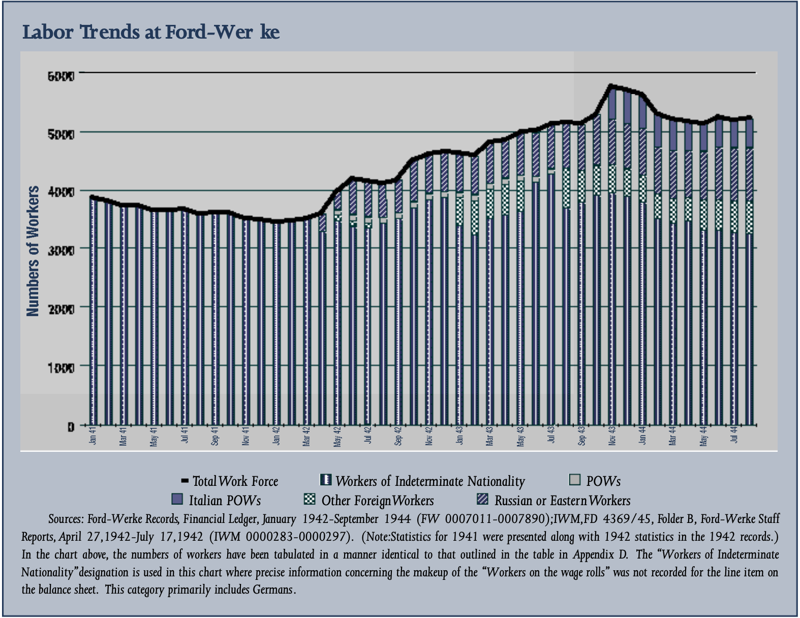 The use of foreign and forced labor at Ford-Werke began in 1940, and generally followed the same pattern as at other industrial facilities in Germany. Foreigners from Eastern and Western Europe, as well as Italian and French POWs were put to work at Ford-Werke. These men and women lived in barracks constructed by Ford-Werke adjacent to its plant site, in what became known in Cologne as the āFord camp.ā[308] After the Reichsbahn [the German railways], Ford-Werke was the next largest employer of forced workers in Cologne.[309] Late in the war, men from the concentration camp Buchenwald worked at Ford-Werke as slave laborers. (See Section 7.7.) (49)