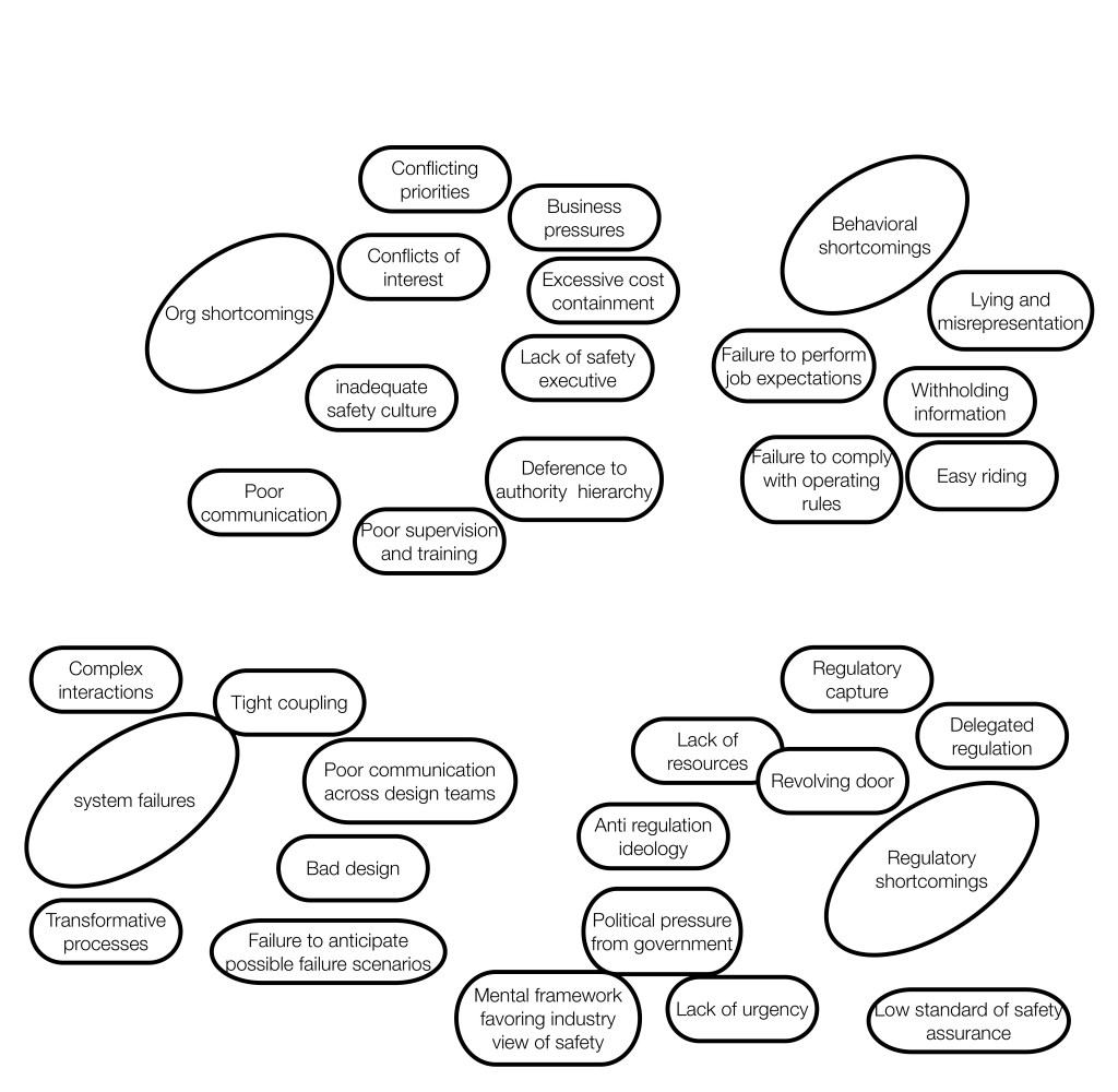 A recurring theme in Understanding Society is the topic of technology failure — air disasters, chemical plant explosions, deep drilling accidents. This diagram is intended to capture several dimensions of failure causes that have been discussed. The categories identified here include organizational dysfunctions, behavioral shortcomings, system failures, and regulatory dysfunctions. Each of these broad categories has contributed to the occurrence of major technology disasters, and often most or all of them are involved.