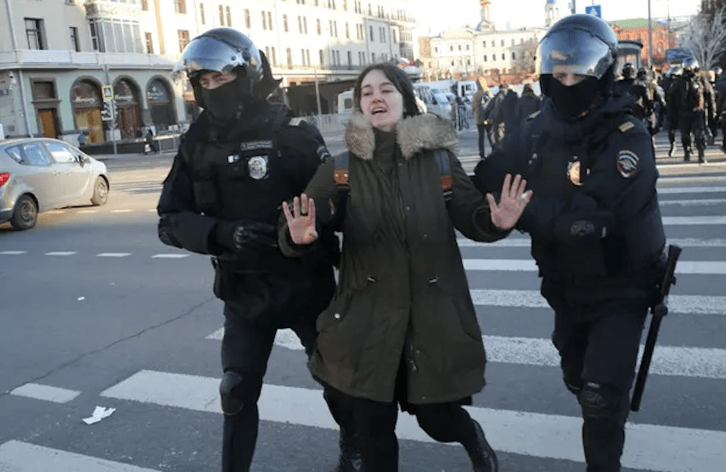 image: Russian police arrest Moscow anti-war protester