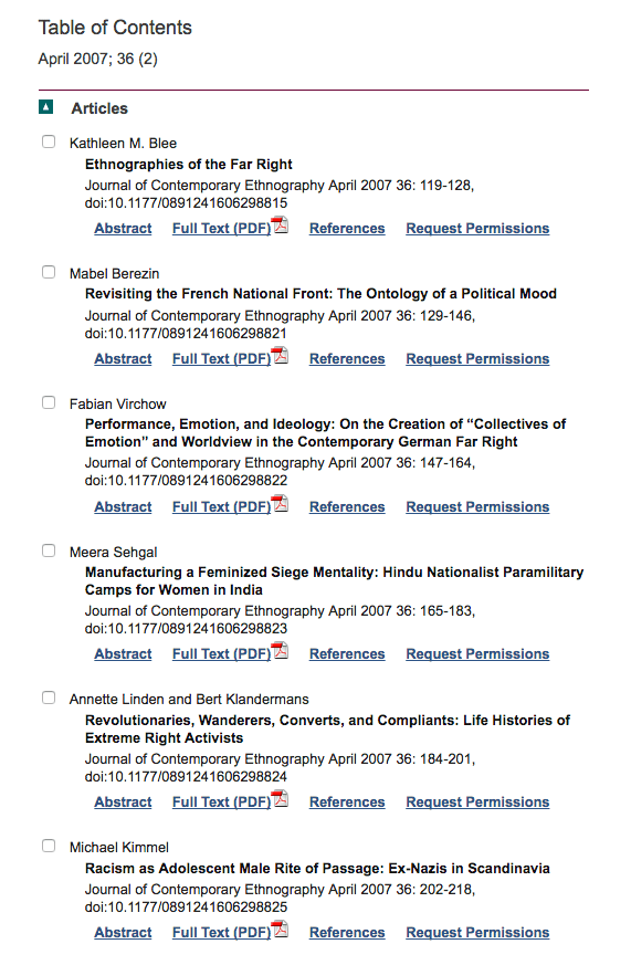 One of Blee’s key contributions has been to highlight the increasingly important and independent role played by women in right-wing extremist movements in the United States and Europe.The JCE issue includes valuable studies of right-wing extremist groups in India, France, Germany, the Netherlands, and Scandinavia. And each of the essays is well worth reading, including especially Blee’s good introduction. Here is the table of contents: